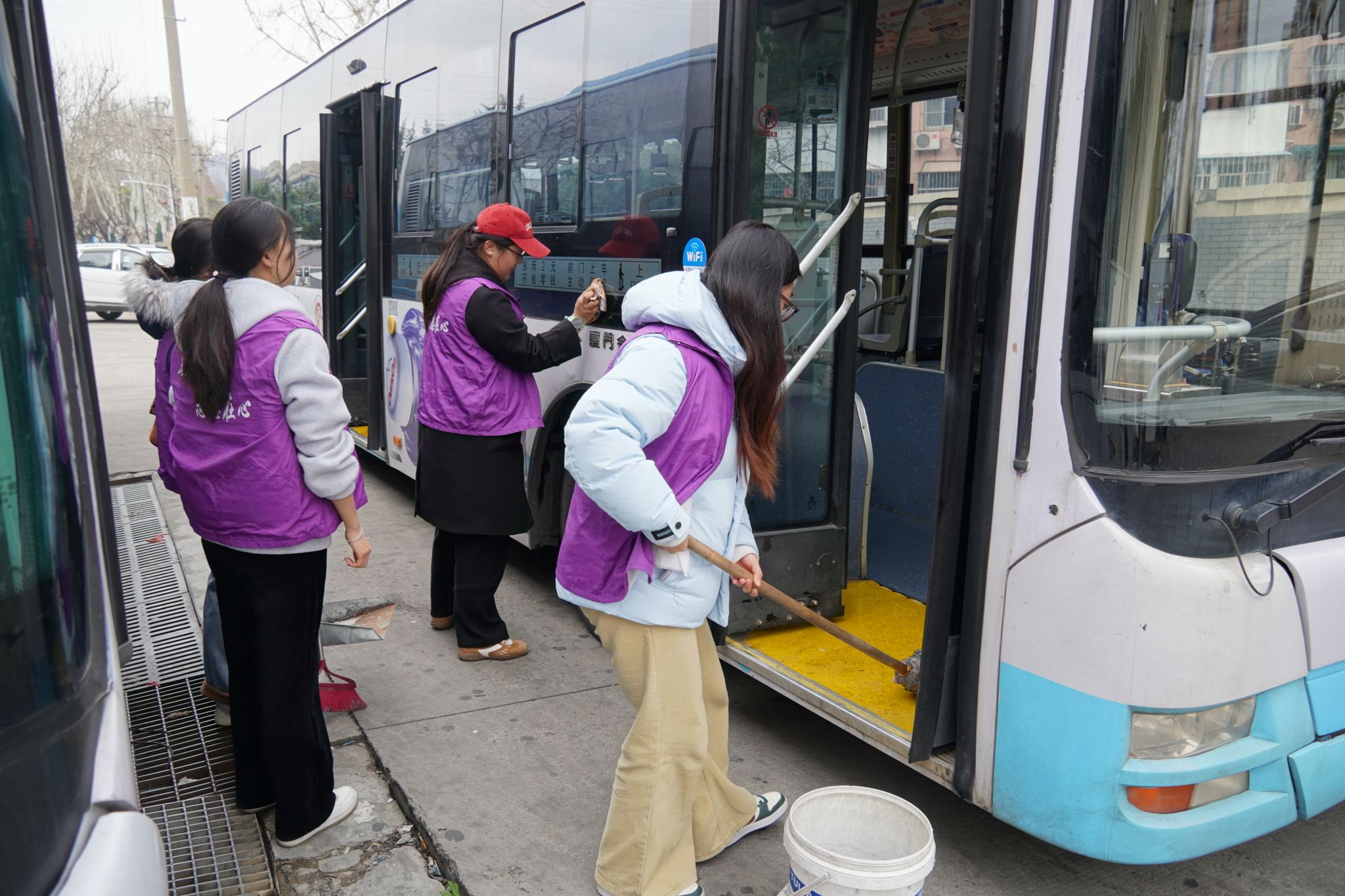 活动伊始,志愿者们迅速进入状态,以小组为单位,对公交车站展开了全方位清洁。扫地组的志愿者们手持扫帚,仔细清扫地面上的纸屑、落叶等垃圾,不一会儿,原本略显斑驳的地面就变得光洁如新。拖地组的志愿者们在保洁阿姨的指导下,认真对公交车内的地面进行清洁,一遍清水拖过,地面上的浮尘被彻底带走,焕然一新。面对公交车上的座椅、车门、栏杆等设施,擦拭组的志愿者们用干净的抹布沾水反复擦拭,金属材质的栏杆在擦拭后泛起明亮的金属光泽,塑料座椅褪去了之前的“暗沉”。