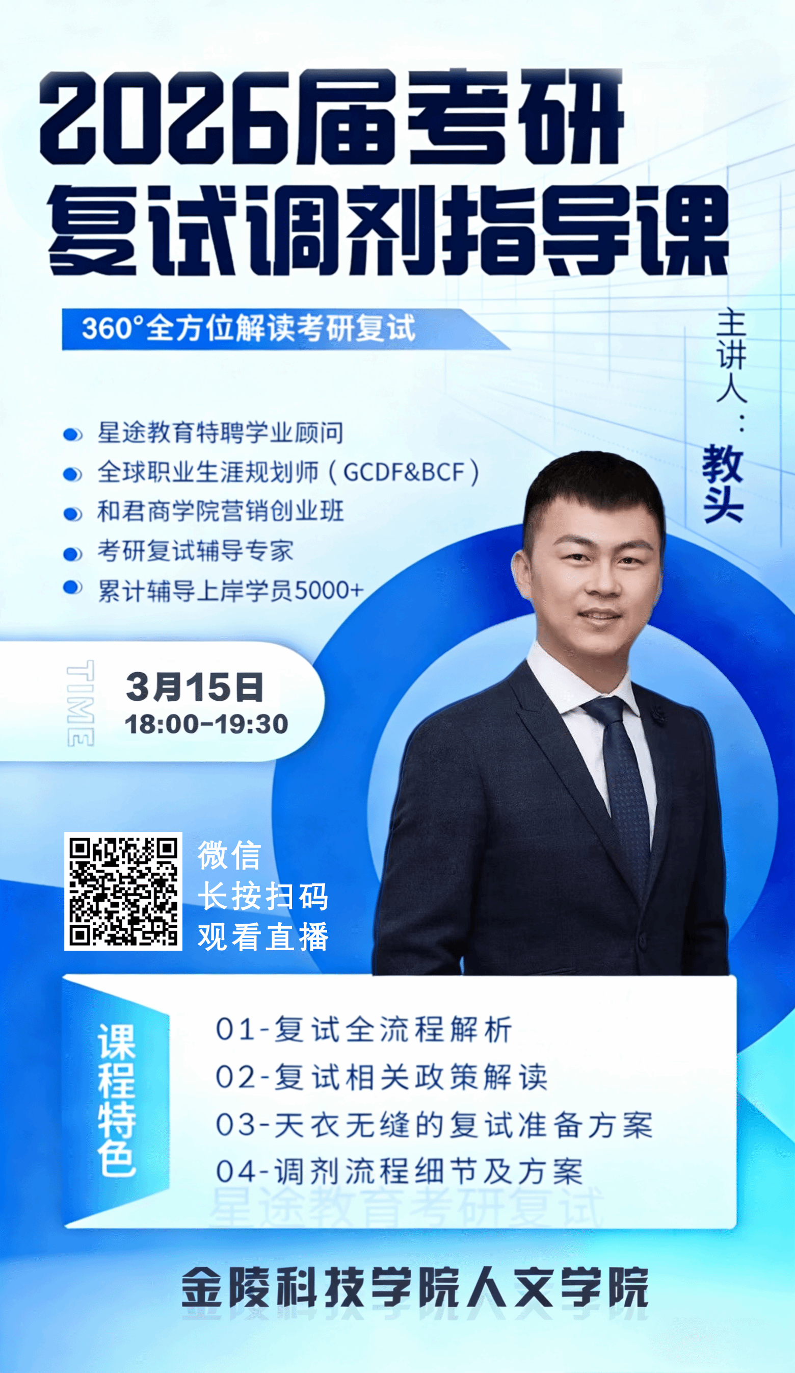 吕老师首先对研究生考试复试的流程进行了系统的介绍,详细解读了复试考察项目,并围绕仪表穿搭、沟通技巧等方面传授了实用的面试策略。他通过具体案例分析,帮助同学们深刻理解并灵活运用面试技巧。随后,他又进一步阐述了调剂的前提条件、操作流程、系统界面以及调剂过程中的常见问题与应对方法。最后,他鼓励同学们积极调整心态,坚定目标,珍惜这次“上岸”机会,精心做好复试准备,祝愿大家都能取得满意的结果。