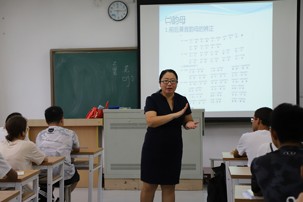 颜丽老师首先向少数民族预科班的同学们介绍了普通话水平测试的相关内容。以测试题目为序,颜老师又将每一题分为三部分,下分4-5个小部分分别进行讲解。每一小部分,颜丽老师都从发音方法、变音练习和掌握记忆方法等几方面做了指导。在此过程中,颜老师走下讲台与同学们近距离互动,并用手势模拟口腔结构,生动而有针对性的讲解,帮助同学们进一步理解与认识了普通话的基本发音技巧。之后,校普通话水平测试站的刘佳老师则为少数民族预科班的同学介绍了普通话水平测试的报名流程和测试注意事项等。