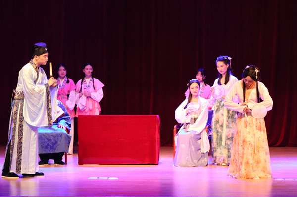 剧场钟声响起,本场话剧《桃花扇》的演出拉开了帷幕。开场,演员们通过对话、独白等形式向同学们展示了故事背景:明朝末年,政局动荡不安,曾经是明朝改革派的“东林党人”逃难到南京,重新组织建立“复社”,和曾经专权的太监魏忠贤余党阮大铖斗争。中场,男主人公侯朝宗和女主人公李香君相识相知,一见倾心,却误入小人圈套。末场,侯朝宗三年杳无音信,香君苦苦等待,终于,喜讯传来,朝宗归来,却以物是人非悲剧收场。