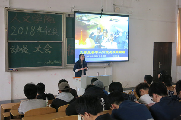 月光冷,刀锋寒。斗酒扬鞭男儿行。酒未醒剑气起,碧血挥洒就丹青。自古男儿以从军为荣,我们金科男儿也一样。为响应国家征兵号召,3月29日12:50在幕府校区教学楼三阶,yl88858永利集团举办了2018年征兵动员大会,向同学们详细解析大学生参军入伍的相关政策。我院辅导员周媛媛老师主讲,15级、16级、17级各班级适龄男生参加了本次动员会。