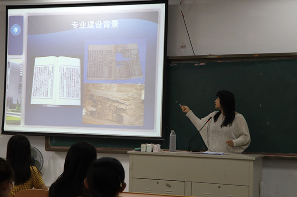 古典文献系主任杨卫军老师,从古典文献字面的意思入手,介绍了古典文献专业发展背景,专业基本设置以及系科建设现状,学校师资建设,实验室建设和实习基地建设做了详细的介绍,使新生对专业学习有了全面客观的认识。