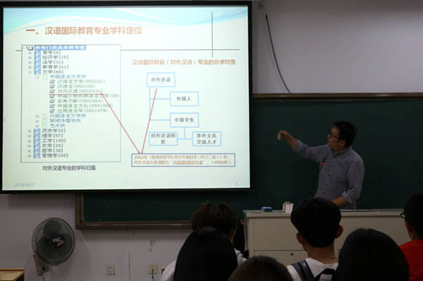 汉语国际教育系主任赵步阳老师,围绕“坚持地方性、应用型办学地位,培养应用型人才为根本”的专业定位,从汉语国际教育专业入手,向新生们介绍了专业的发展过程、现状与背景、专业培养计划、师资队伍等,提出要在理论知识学习基础上,培育具有扎实的汉语与英语基础,对中国文学、中国文化及中外文化交往有贡献的应用型、复合型人才。