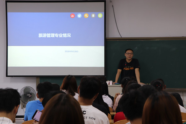 在各系专业教育中,旅游管理系主任汤澍老师,就专业需求导向、应用型人才培养,师资力量、大学生创新创业项目和专业课题研究五大方面展开介绍,引导学生敢于创新,勇于创业。