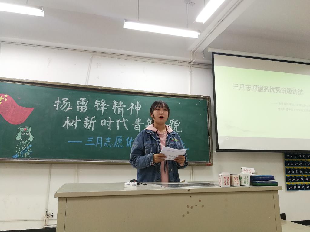 评选会上,各班级精心制作了PPT和活动视频,通过声情并茂的讲演展示了志愿服务工作和收获。志愿者中,有前往红山森林动物园向市民宣扬保护动物的,有在玄武湖景区、中山陵风景区服务游客的,有向基层工作人员送去温暖的,有清洁校园环境卫生的。特别值得一提的是,18汉语国际教育(2)班的同学们顶着寒风,凌晨五点起床为早起工作的环卫工人、加油站工作人员、公交司机等送上一份暖暖的早餐,不仅暖了胃,也暖了心。他们用实际的行动,向社会展示了作为金科学子的新时代“雷锋精神”。最后,经过现场评选和微信平台投票,18汉语国际教育(2)班获得最具奉献班级奖。