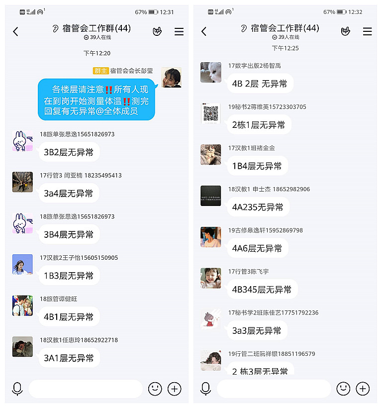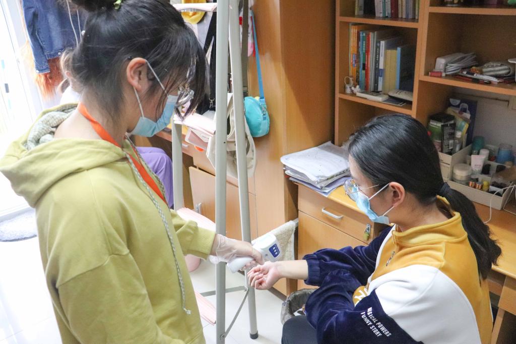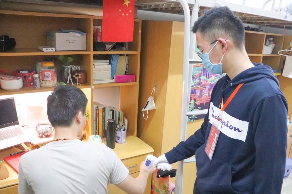 由学院学生宿舍管理委员会同学组成的宿舍网格员,负责学生的晨午检体温测量。每日早8:00和午12:20,网格员准时上岗。他们首先自测体温,体温无异常,再佩戴口罩、工作证。他们手持体温枪,在一个个宿舍里,一层层楼层间,一栋栋楼宇间,忙碌而有序工作着。全院4栋宿舍楼,31个楼层,377间宿舍,1245位同学,36名网格员,仅仅五分钟就可准确高效地完成体温测量工作。这不仅要依靠所有同学的积极配合,更需要每一位网格员严谨认真的工作态度。每天体温检测时,网格员还会督促宿舍同学做到每日宿舍通风两次,养成良好的学习、生活习惯,按时作息。