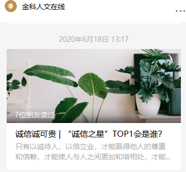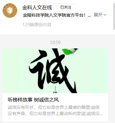 6月15日至30日期间,为鼓励和引导学生养成良好的诚信品德,学院开展了“诚信之星”评选活动,将 “诚信之星”优秀事迹在“金科人文在线”公众号平台进行展示。通过树立诚信自强的典型人物,增强大学生的诚信意识,形成了崇尚诚实守信的良好风气,引领诚信文明新风尚。