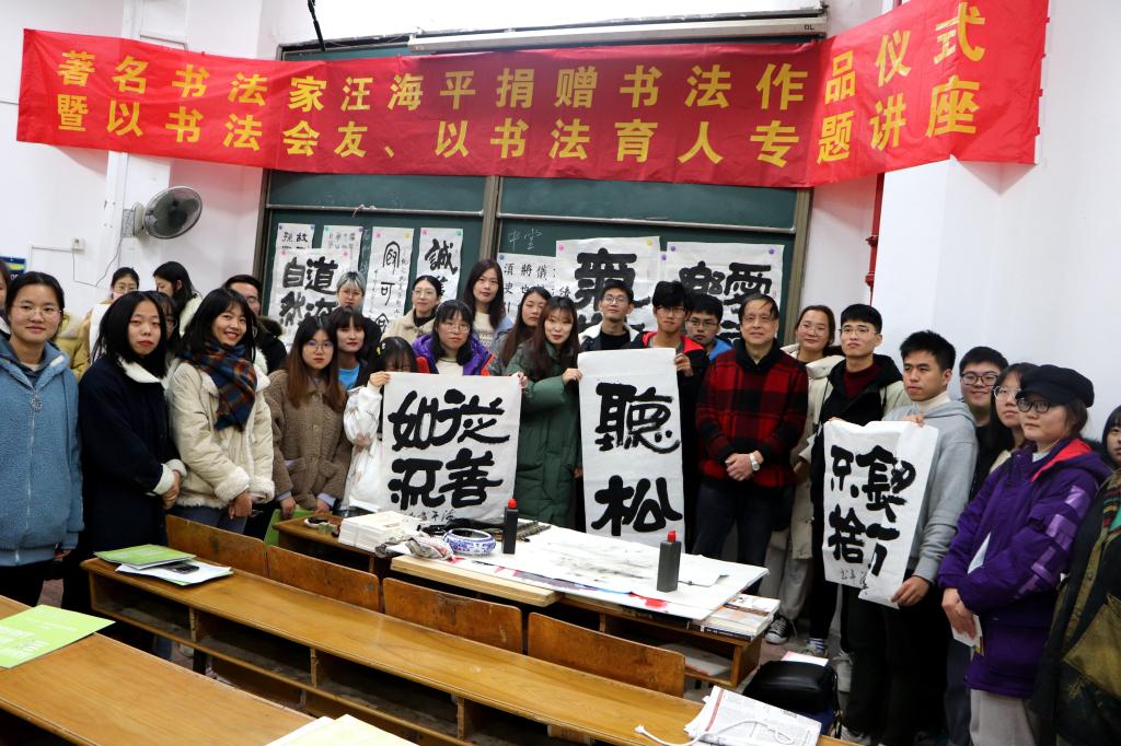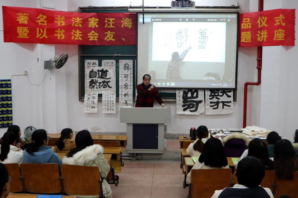 一笔一划,墨香缕缕,诉不尽的字字情深。12月9日下午2:30,在幕府校区农科楼114教室,yl88858永利集团特邀书法家汪海平老师,开展了 以“书法会友,以书法育人”讲座,yl88858永利集团党委书记吴轶军、院长张维亚、副书记周建峰、副院长赵步阳,学工办主任童明明及辅导员老师、学生代表参加了此次活动。吴书记担任活动主持。
