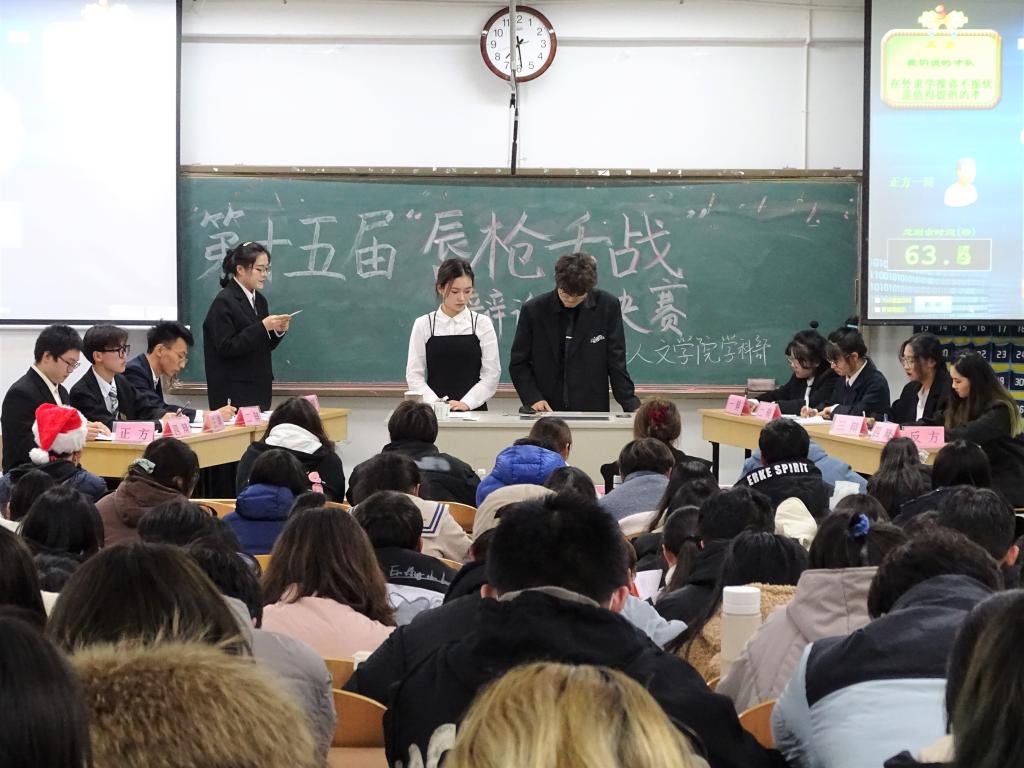 辩论赛是语言的校量,更是思维的碰撞。12月24日,在图教楼B405yl88858永利集团举办了第十五届“唇枪舌战”辩论赛的决赛,担任本次决赛的评委有辅导员梅冬琴老师、yl88858永利集团院学生会执行主席王碧粟和历届三位辩论队优秀辩手。