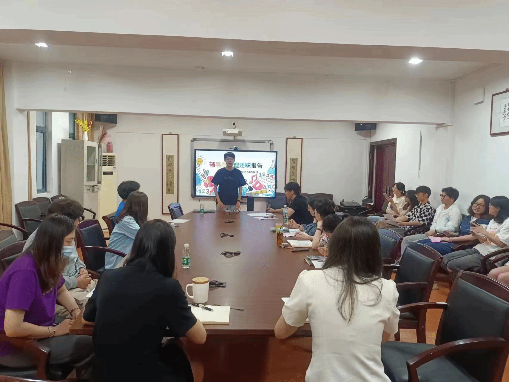 评审会上,全体辅导员助理结合精心制作的PPT,对过去一年里开展的工作进行了详细的述职。重点分为3个部分:新生入校前的联系沟通工作,入校报道相关工作及新生适应工作。同时,大家也就工作中出现的一些问题进行了反思与探讨。负责22行政管理(1)班的贾金荣同学提出,做好辅导员助理工作,首先要确保新生在校的安全问题,其次是提高同学们对大学生活的适应能力。在确保日常管理工作有条不紊开展的同时配合辅导员进行思想政治教育工作。负责22古典文献班的候心愉同学展示了利用专业平台与新生们探讨专业特色以及学习技巧的经验。在分享阶段,大家也根据自身经厉,现场解答了意向报名2023级新生辅导员助理同学的问题。述职结束后,童明明老师总结发言,他首先肯定了大家一年来的幸苦付出,并希望在接下来的工作中,新老辅导员助理之间可以加强交流,相互分享,积极开展班级工作,在团支部建设中出谋划策,共同建设美丽校园。