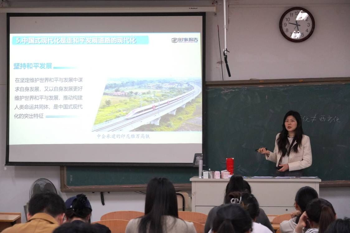 第一场讲座中,王蕾老师围绕“展现新图景,创建新形态”、“拥抱新机遇,无畏新挑战”、“锚定新目标,铸就新伟业”三方面展开。通过分析和研究当前国内外政治、经济、社会和文化等领域现象,揭示社会历史发展内在规律,阐明党和国家的路线、方针和政策,帮助同学们更好地理解和把握世界与中国的发展大势。