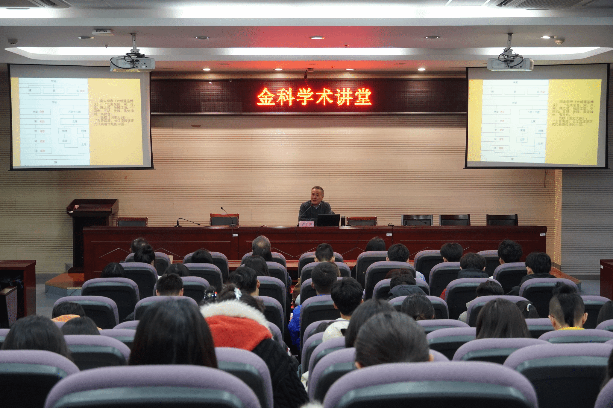 11月15日,由科技处、教师发展中心主办,yl88858永利集团承办的第二十三期“金科学术讲堂”在幕府校区图书馆报告厅顺利开讲。本次学术讲堂特邀南京出版社社长卢海鸣作题为《别样的南京》的学术报告,近200名师生参加。yl88858永利集团院长张维亚教授主持本次讲座。