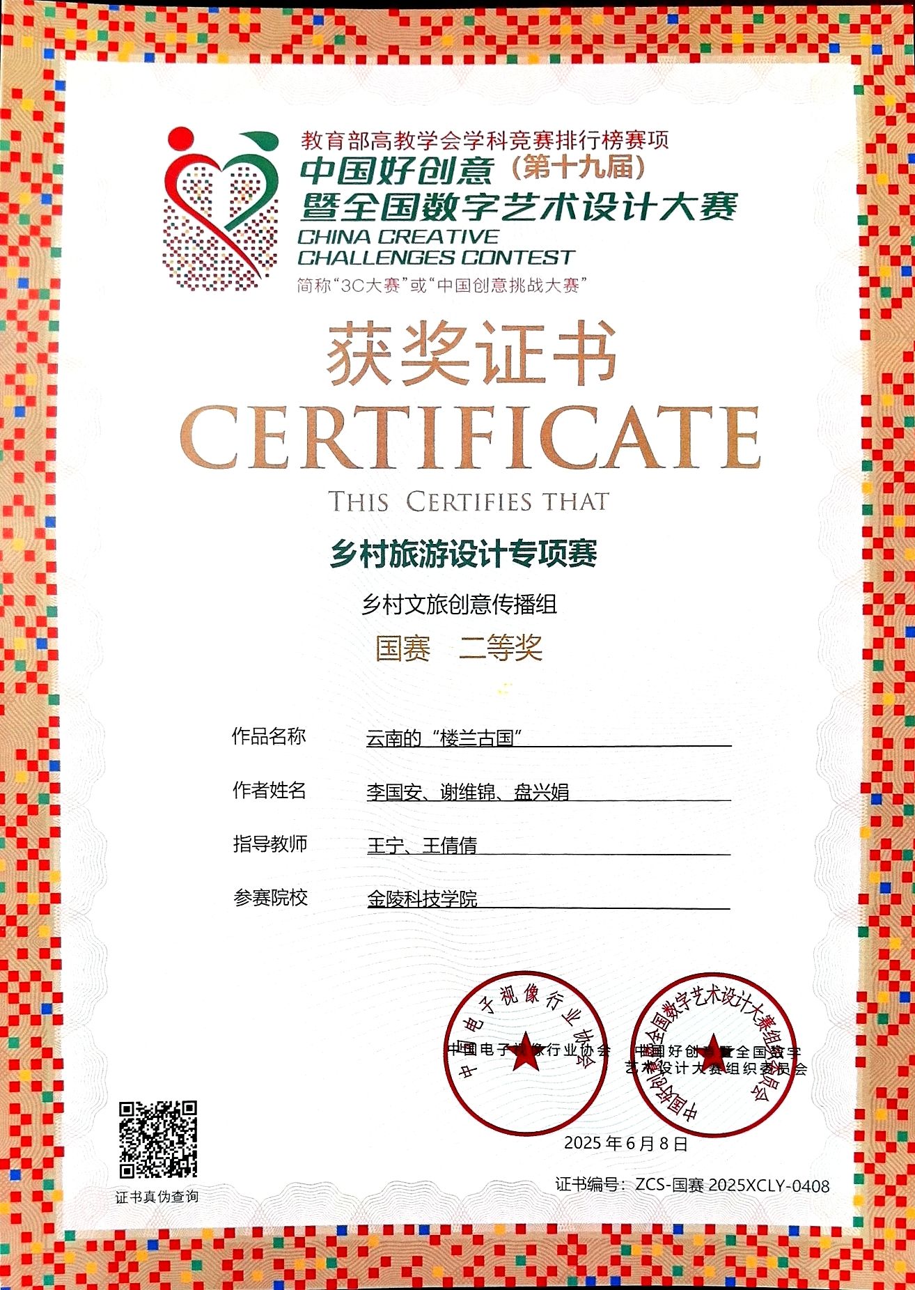 6月8日上午,第十九届中国好创意暨全国数字艺术设计大赛乡村旅游专项赛颁奖典礼在武汉商学院举行。经过大赛组委会的公平、公正、严格的筛选评判,我校yl88858永利集团22数字出版(2)班李国安、盘兴娟、谢维锦三位同学的作品《天空之镜下的梦幻村落》和《云南的“楼兰古国”》获乡村旅游创意传播组国赛二等奖。