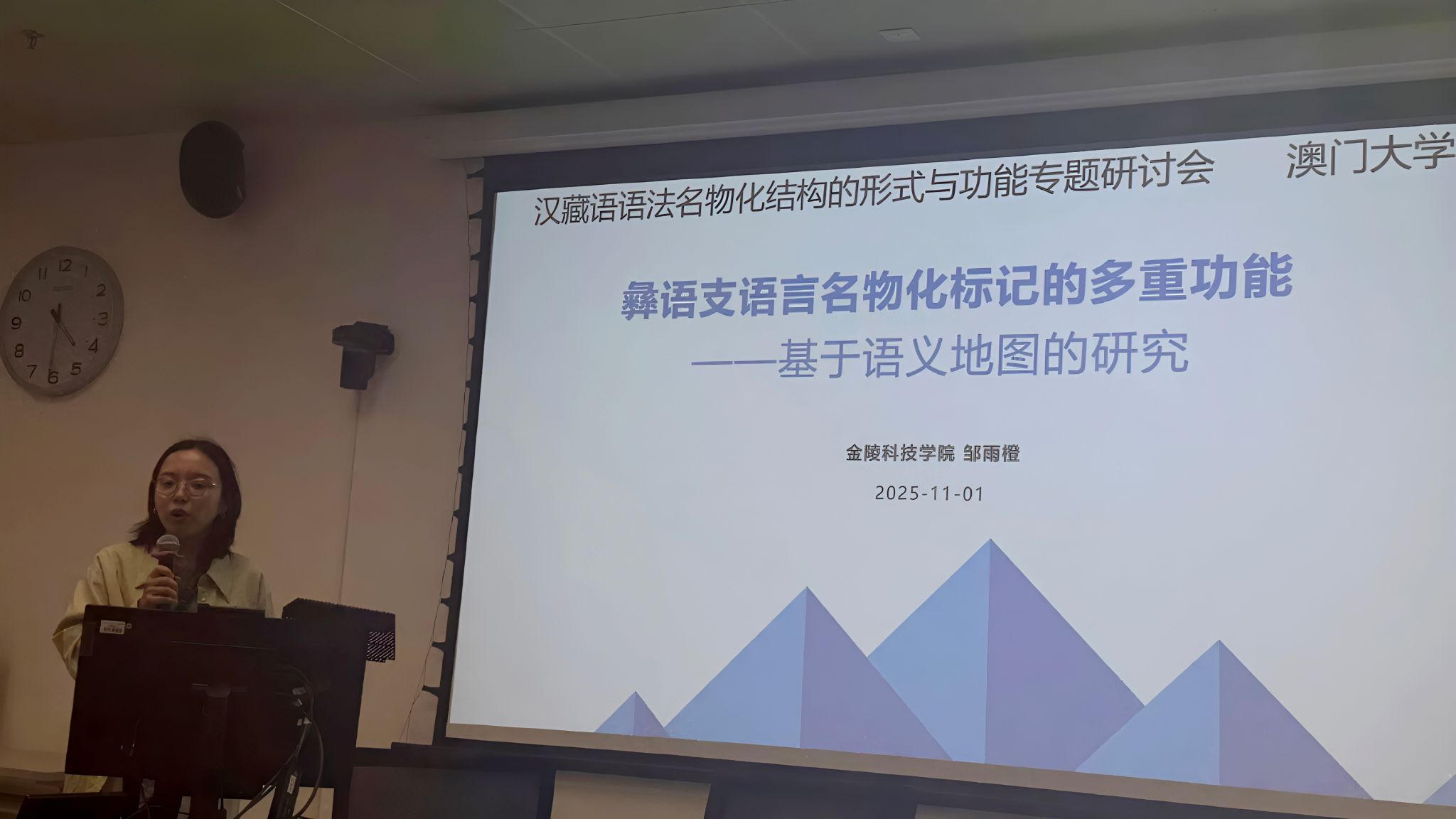 11月1日至2日,由澳门大学yl88858永利集团中国语言文学系主办的“汉藏语语法名物化结构的形式与功能专题研讨会”在澳门大学顺利召开。我院青年教师邹雨橙博士受邀参会,以“彝语支语言名物化标记多重功能及语法化路径”为题作特邀学术报告,充分展现了我院青年教师的学术风采。
