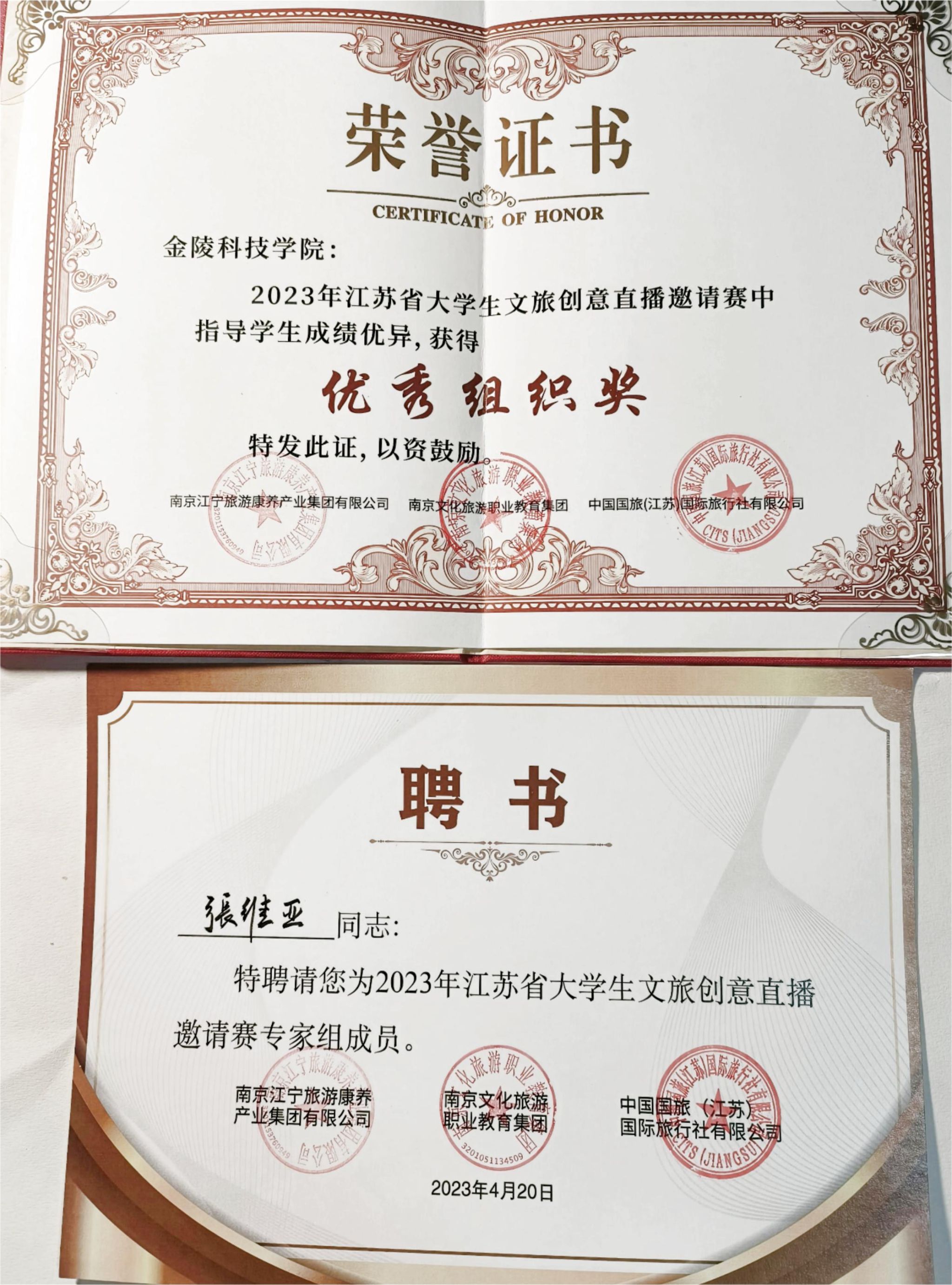 比赛中,全市8所高校40支队伍参加,大家以现场抖音直播的形式,在江宁钱家渡景区,通过大学生们年轻的视角,发挥文旅专业师生的专业优势,线上种草吸粉,吸引了更多游客出游踏青。来自22旅游管理(专转本)班学生李汪琴、王雨佳、耿紫嫣、吕婉茹,20旅游管理的高峰、哈昕阳,分别在非遗工坊、春风桥、梁台映月亭、淼淼营地等景点进行了“非遗手工—南京金箔、方山裱画”、“传统水上婚礼”和“稻田汉服秀”等不同项目的直播,以年轻人喜闻乐见的方式弘扬了中华优秀传统文化的同时,助力乡村景区发展建设。同学们不畏日晒,连续4个小时直播获得了超千人的观看量,累计超5万的点赞量。最终,李汪琴和王雨佳凭借超高的观看量获得了“优秀主播”和“流量战将”奖。85588永利集团获优秀组织奖,yl88858永利集团院长张维亚特聘为邀请赛专家。